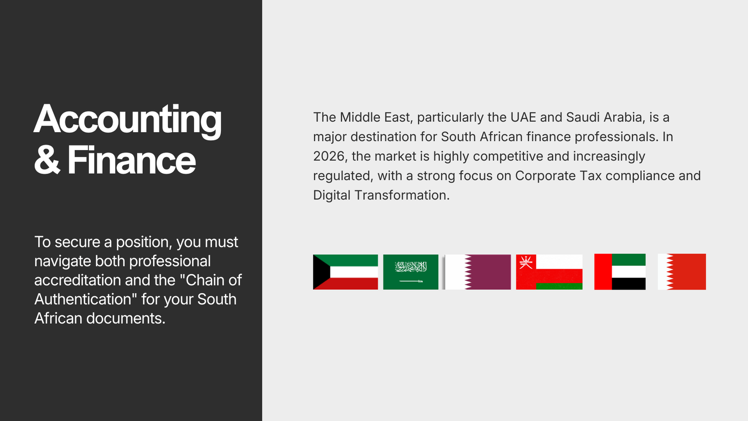 The Middle East, particularly the UAE and Saudi Arabia, is a major destination for South African finance professionals. In 2026, the market is highly competitive and increasingly regulated, with a strong focus on Corporate Tax compliance and Digital Transformation.